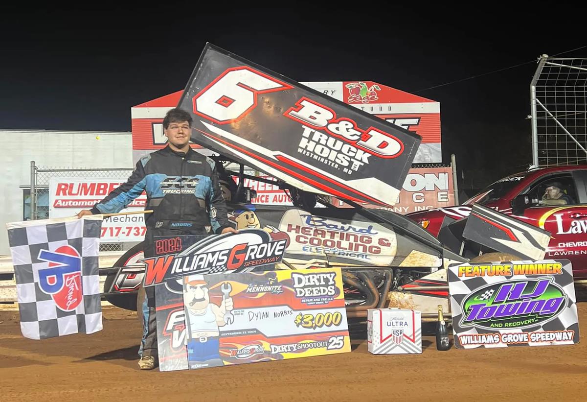 In the Dirty Deeds 25 for the HJ Towing & Recovery 358 sprints, Hanover’s Dylan Norris took the win after getting by Justin Foster mid-race for the $3,000 paycheck.